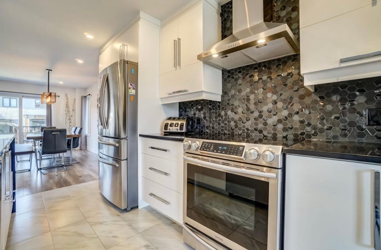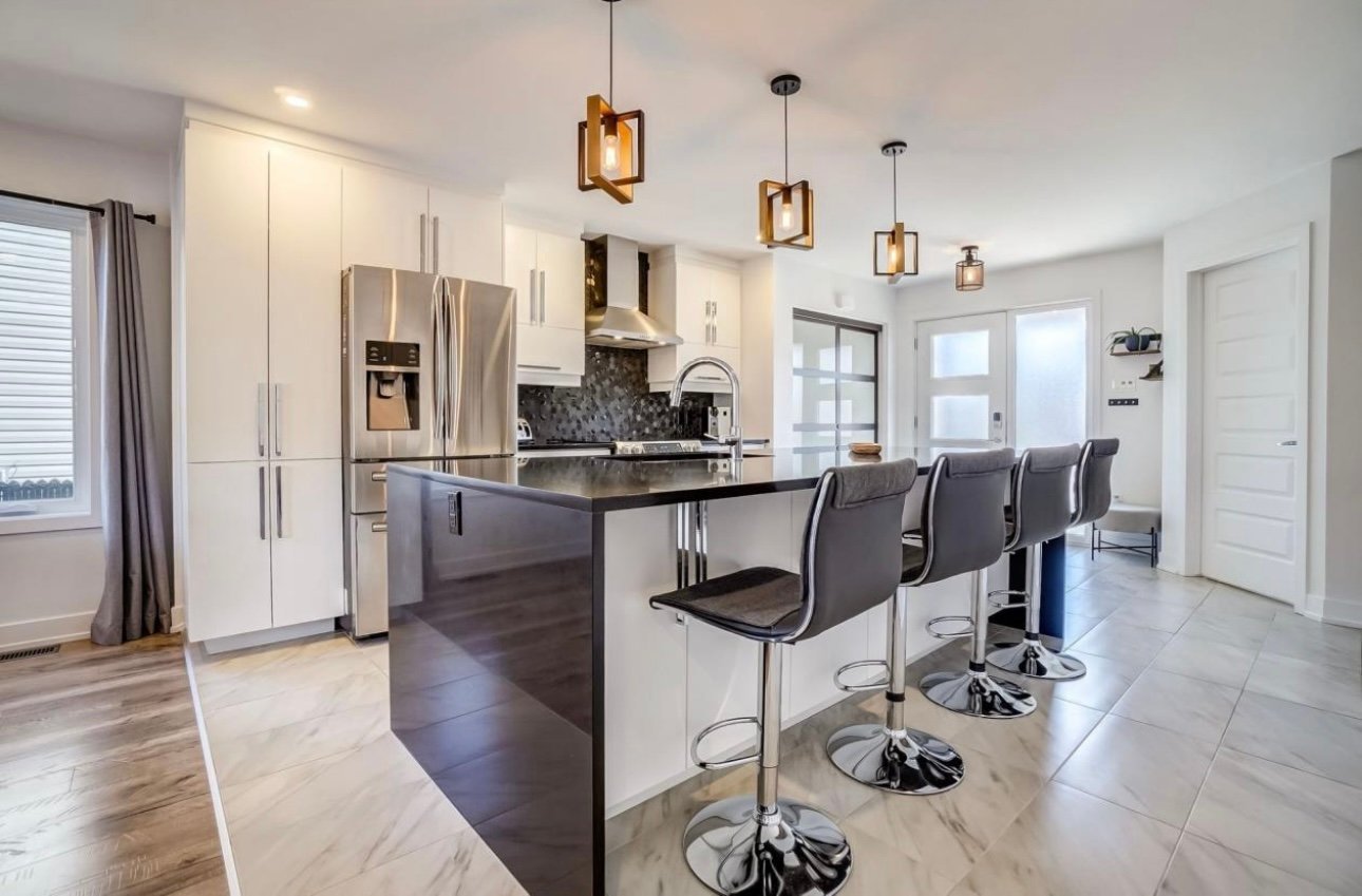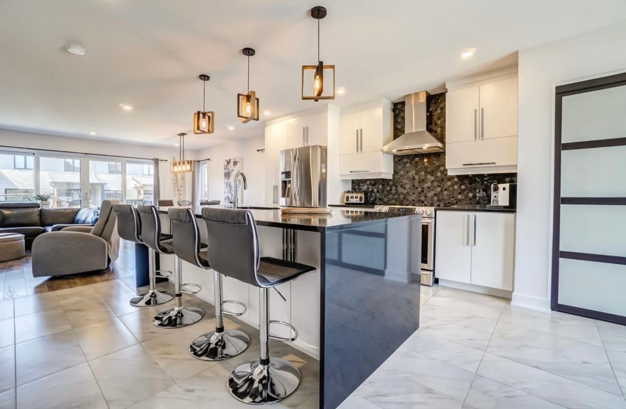 - Cuisine moderne avec îlot central de 9 pi et porte patio