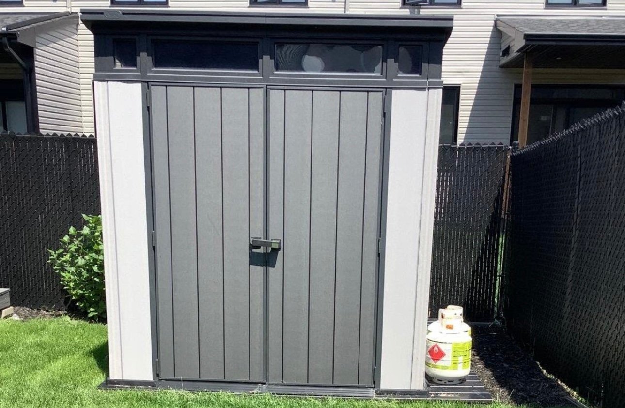- Cour extérieure aménagée avec pergola, remise et système
